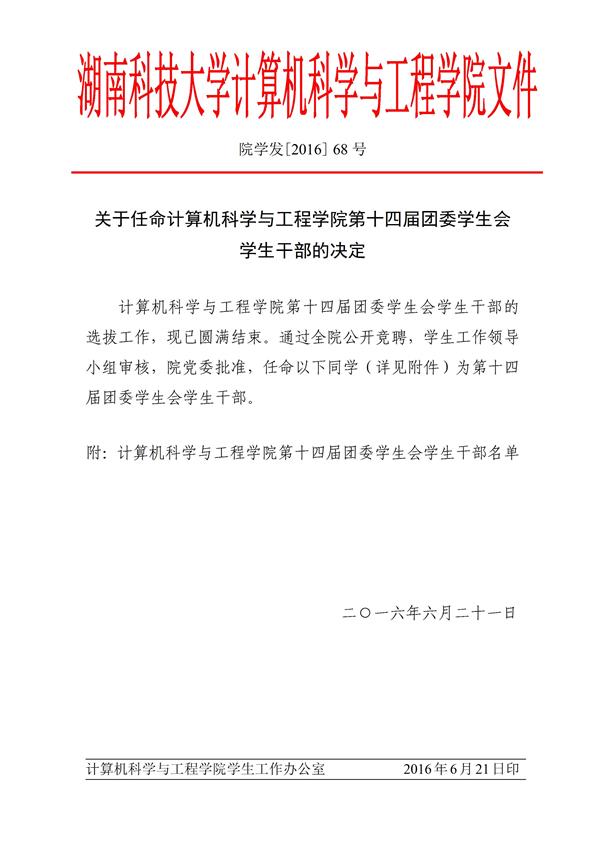 关于任命计算机学院第十四届团委学生会学生干部的决定