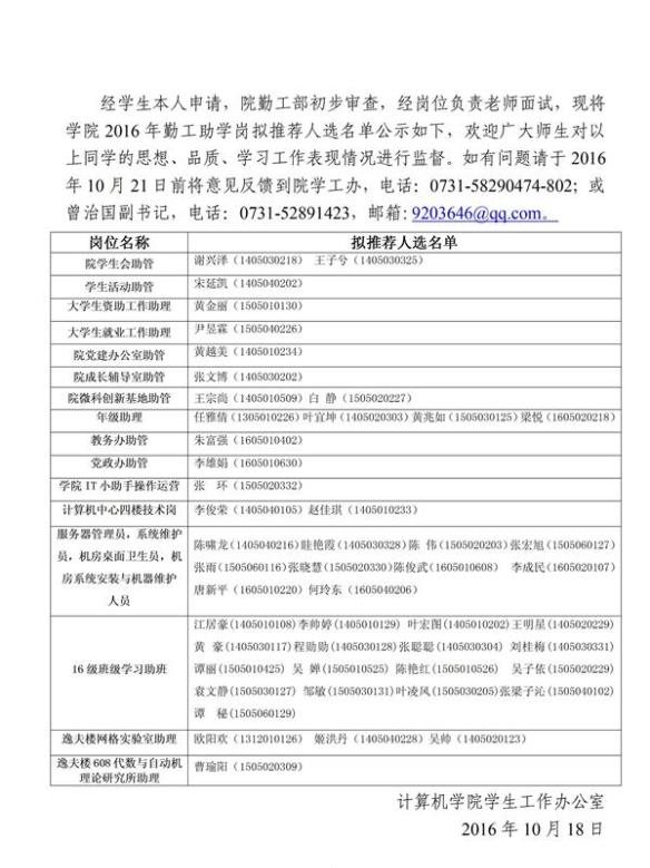 计算机学院2016年勤工助学岗拟推荐人选公示