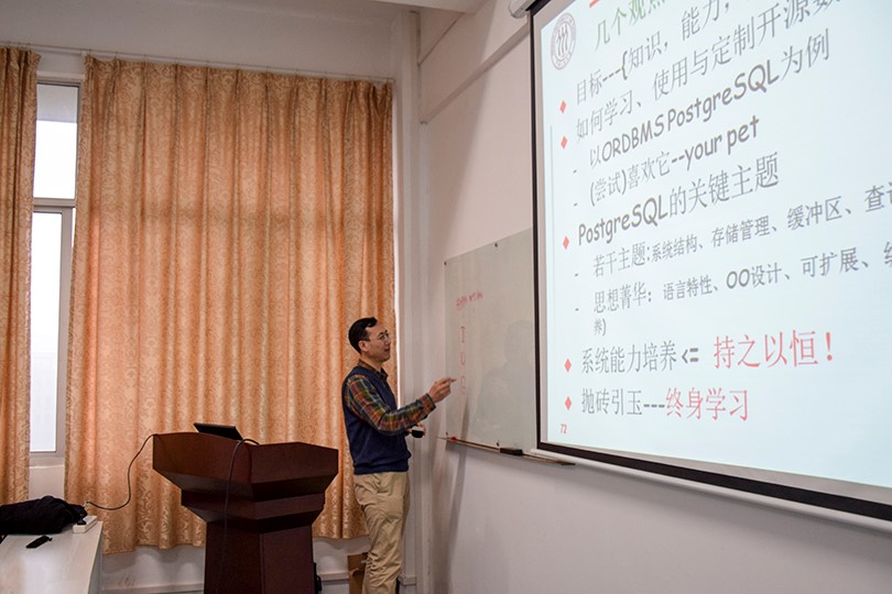 讲座伊始,张孝首先简述了数据库方面的相关背景,并提到信息技术方面的“卡脖子”事件。他提出,为了杜绝这类事件,就必须从根本上解决自主研发的问题,从而引出本次讲座的主题。对于“数据库系统实现与系统能力培养”,张孝将其划分为三个过程。一是扩展知识,比如DBS实现知识等;二是提高能力,应该掌握像系统设计、抽象建模等技术;三是培养素质,例如全局意识、系统观点等是必不可少的。随后,张孝简单地梳理了一下数据库系统的发展史,他认为计算机理论想要生存下去就需要落地,要落到实处,要生成系统。紧接着,张孝对如何培养系统能力提出了一个思路,即利用网络上的开源数据库进行尝试。对于各种开源数据库的利弊,张孝也一一阐述,让在场的师生们受益良多。