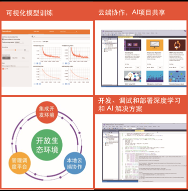 此外,微软人工智能工具覆盖了开发、调试、部署的整个项目生命周期,其示意图如下图所示。该工具基于Python 跨平台可视化开发,具有完整的 AI 项目全生命周期管理,可扩展、全开放、全面支持主流框架,充分利用 AI 混合云平台和资源提供了一系列的人工智能工具。