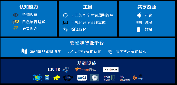 新一代人工智能开放科研教育平台如下图所示,该平台涉及人工智能全生命周期的结构,基础设施,覆盖热门的计算框架、硬件,以及数据库;管理平台解决规模化运算、系统级智能优化等生产力问题;提供易用的AI认知能力服务,提高生产力的全生命周期的工具,提供资源、数据等的共享等服务。