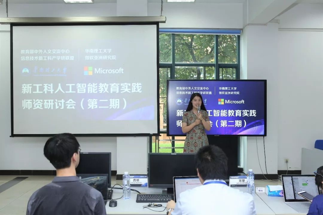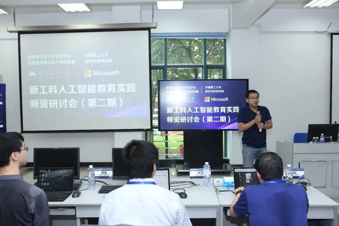 在此背景下,tapplay官网教师刘敏博士于2018年7月25日至28日赴广州参加了第二期新工科人工智能教育实践师资研讨会。本次研讨会由教育部中外人文交流中心、信息技术新工科产学研联盟共同指导,新工科联盟人工智能教育工作委员会担任主办方,华南理工大学与微软亚洲研究院联合承办。全国多所高校的教师积极参与,与资深研究员、行业专家面对面交流人工智能领域的教育教学经验,探讨未来人工智能应用案例在高等教育教学中的实践问题。