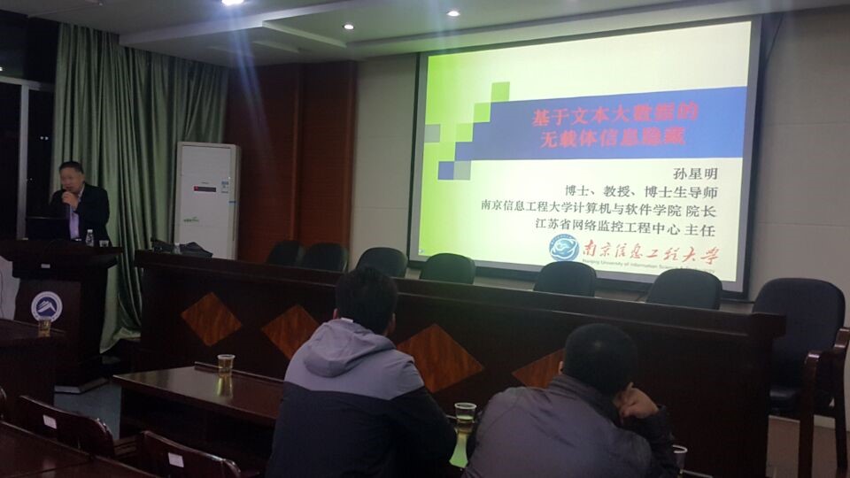 2017年11月27日晚上8点,南京信息工程大学计算机与软件学院院长孙星明教授应邀在逸夫楼201报告厅做了题为“基于文本大数据的无载体信息隐藏”的学术报告。tapplay,tapplay官网,tapplay登录入口老师和部分研究生、本科生参加了此次报告会,讲座由院长刘建勋主持。