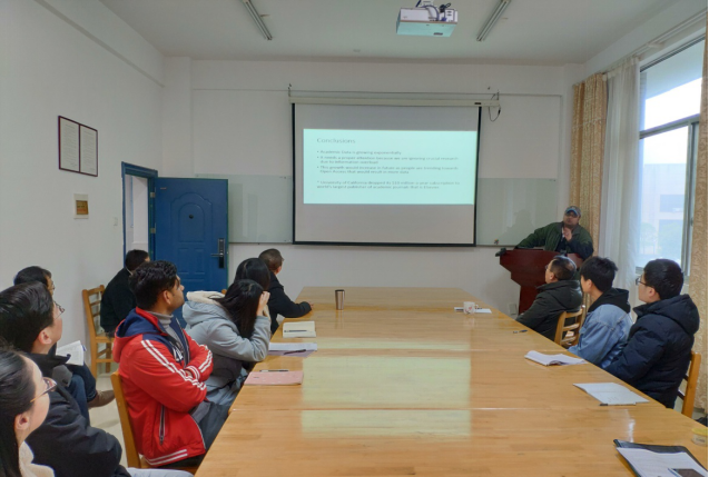 报告伊始,Karim 首先对学术推荐系统做了简单的介绍,而后提出了多级引文网络推荐系统的思想,并详细介绍学术大数据多层次引文网络推荐系统的设计方案。Karim 提到,考虑到数据挖掘、知识提取、书目分析、推荐系统等各方面需求的新挑战以及系统的准确性和效率,该项研究可以有效识别用户需求,并相应地过滤冗余信息。Karim 还提到在设计过程中添加的“元知识”库,有助于系统在不同的兴趣领域之间建立联系,促使跨领域的知识交流,做出更好的科学贡献。Karim在此次报告中发表了独到的见解,内容丰富,开拓了在场师生的学术视野。