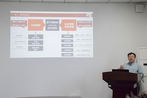 紧接着,郑东教授进行了题为“基于国密算法的 Android 终端安全系统设计”的学术报告。郑东通过专业的学术知识及数据对Android系统进行了简单介绍。他依次分析了移动终端安全漏洞、移动终端隐私保护机制与应用部件控制、移动终端远程管理等方面内容。报告过程中,郑东通过展示学生的研究成果和现下新款特制手机讲述了手机存在的巨大隐私安全问题,在座师生深受启发。