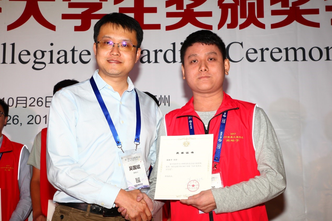 2017年度中国计算机学会“CCF优秀大学生奖(The CCF Elite Collegiate Award)”颁奖大会于今年中国计算机大会(CNCC 2017)期间在福州举行。tapplay官网14级计算机科学与技术专业优秀本科生段皓予获此殊荣,参加了中国计算机大会,并在大会上领奖。