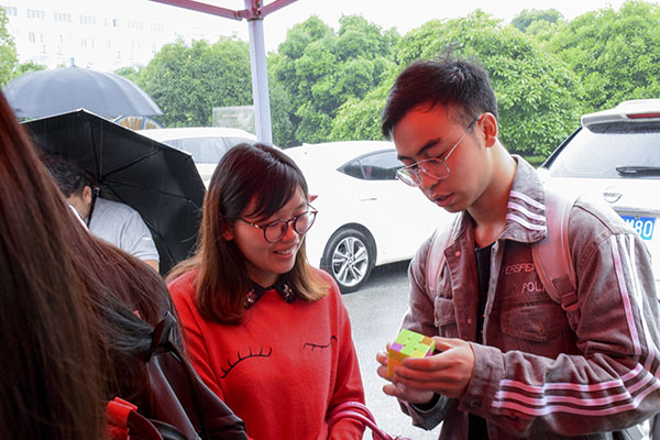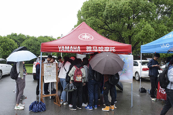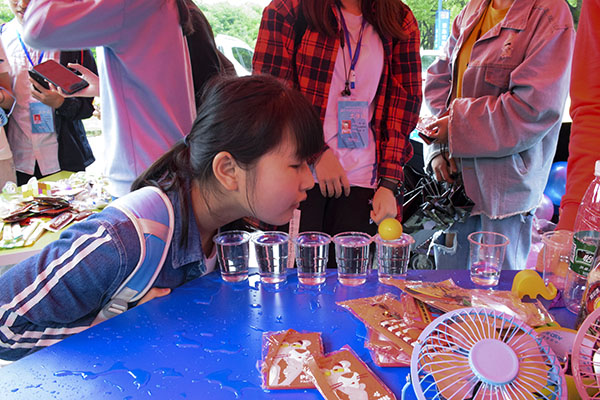 活动伊始,丰富多样的摆点小游戏吸引了不少过路同学的眼球,连绵不断的小雨也未能阻挡同学们参与活动的热情。摆点现场设有考验思维能力和动手能力的“魔力转圈圈”,需要用嘴将乒乓球吹进杯子中的“欢乐弹弹球”以及挑战心跳与合作的“背对背拥‘爆’”。其中“欢乐弹弹球”备受同学们青睐,“背对背拥‘爆’”更是引爆了全场,欢声笑语与气球的爆炸声夹杂在一起,现场气氛十分活跃。