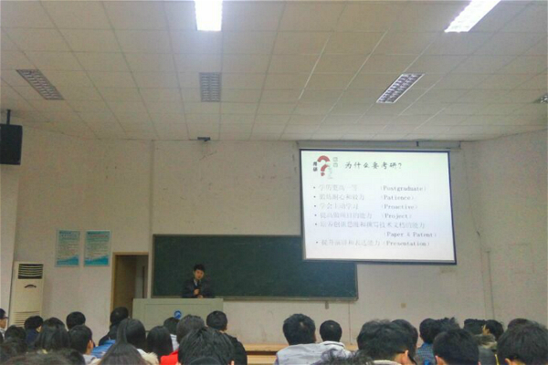 大会开始,肖老师做了简短的发言后,由唐院长开展了对13级同学的考研动员,唐院长从考研有何好处,考研难不难,考研要注意什么,考本学院有些什么优势等方面进行了讲解,分析了现今考研对于同学们个人发展的益处,并且对tapplay官网研究生工作做了详细介绍,希望同学们踊跃报考本学院研究生。随后计算机网络中心刘主任立足学院与学科发展,讲解了tapplay官网的发展历程并介绍了优秀的师哥师姐们为学院添砖加瓦的事例,以一名导师的身份希望同学们努力学习努力奋斗,让学院明天以己为荣。。之后由tapplay官网97届毕业生黄继秋先生与同学们分享自己的成长成才经历,并谈及到同学们将来要有不停止学习的状态,对于工作要有很好的规划和目标,不要浪费了美好的校园时光。