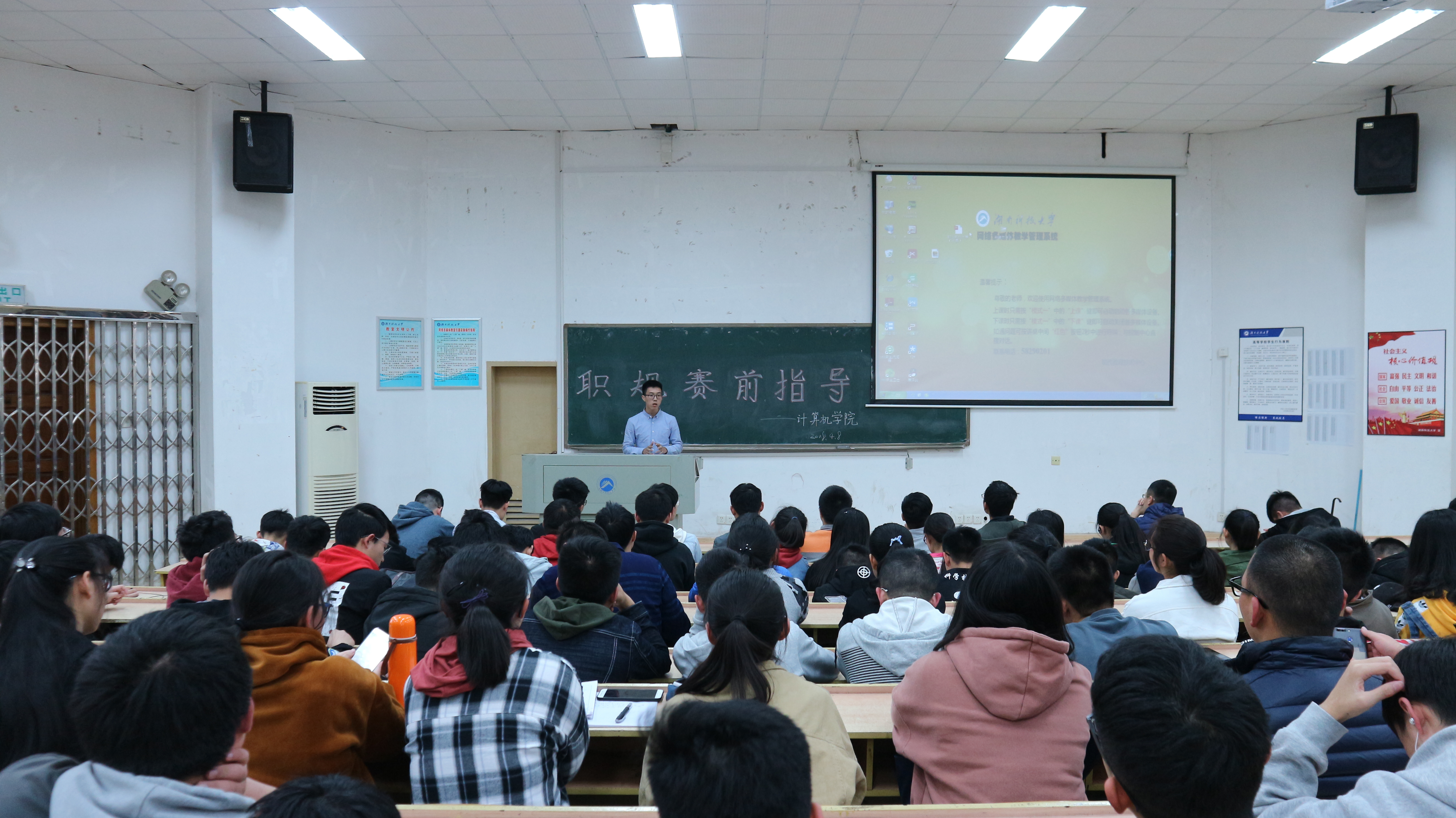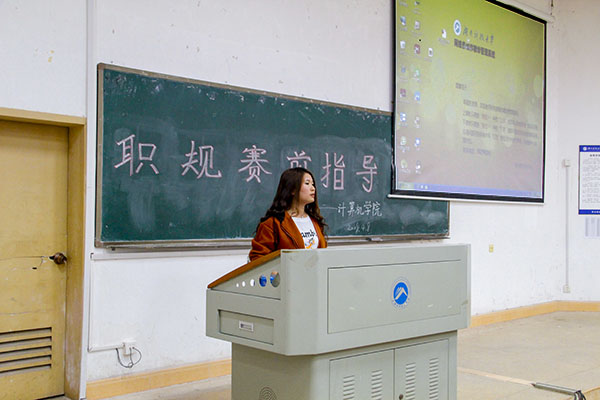 会上,16级的几位优秀选手为大赛作出了经验分享,并给予了同学们比赛的方向。计算机二班汤周从家庭、人生经历等方面率先分享自己对职业选择的认知。他期盼大家最先站在对自己未来规划的角度上为大赛做准备,其次带着比赛的目的来完成相关任务,并且期待着同学们能从职业规划中有所收获。而后,网络工程一班王真生动地描述了参加本次大赛对自身能力提升的影响,计算机一班张子晗则具体讲述了怎么在实用型、美观性方面掌握对规划书以及制作ppt的技巧。
