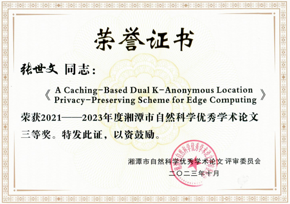 近日,由湘潭市科学技术协会、湘潭市人力资源与社会保障局、湘潭市科学技术局、湘潭市财政局组织的2021-2023年度湘潭市自然科学优秀学术论文评选结果揭晓,tapplay官网梁伟教授撰写的《Spatial-Temporal Aware Inductive Graph Neural Network for C-ITS Data Recovery》论文获得一等奖,张少波教授撰写的《ALPS: Achieving Accuracy-aware Location Privacy Service via Assisted Regions》论文获得二等奖,张世文副教授撰写的《A Caching-based Dual K-Anonymous Location Privacy-Preserving Scheme for Edge Computing》论文获得三等奖。