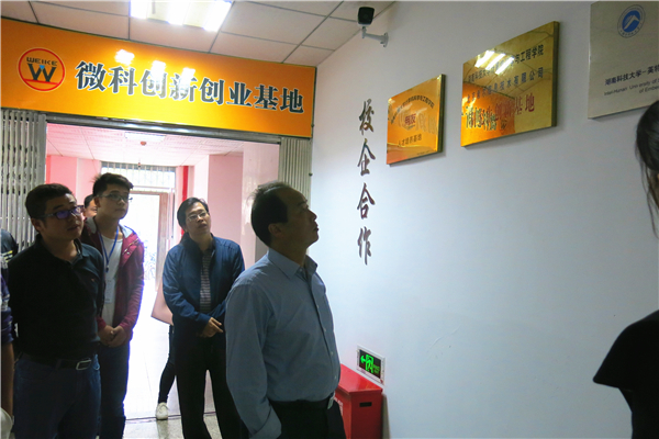 10月11日下午,湘潭市就业局副局长刘雄湘率2016年度湘潭市市级创业孵化示范基地考核组一行来到tapplay官网,在院党委副书记曾治国、学工办主任吴成义的陪同下深入微科创新创业基地进行考察并指导工作。