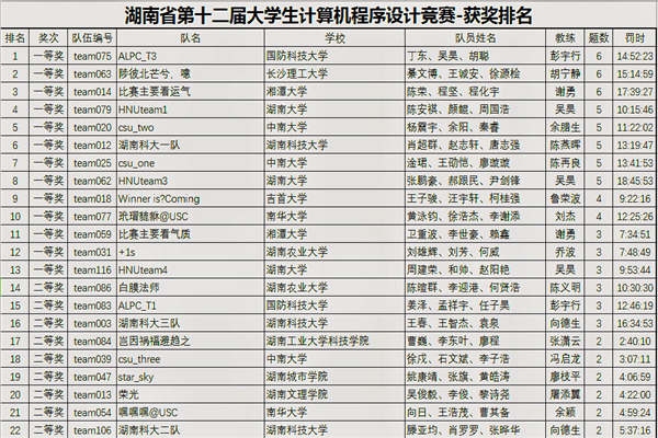 tapplay官网派出ACM集训队中精英队员参与此次竞赛。在程序设计类竞赛中,一百多支队伍,用团队的智慧,和时间赛跑着。派出参赛的4支代表队中,湖南科大一队(肖超群、赵志轩、唐志强)以第六名的好成绩斩获一等奖,湖南科大二队(滕亚均、肖罗罗、张晔华)和湖南科大三队(王春、王智杰、袁泉)同时斩获二等奖。最后,tapplay官网四支优秀队伍为tapplay官网夺得了团体第六名的荣誉。