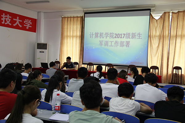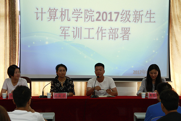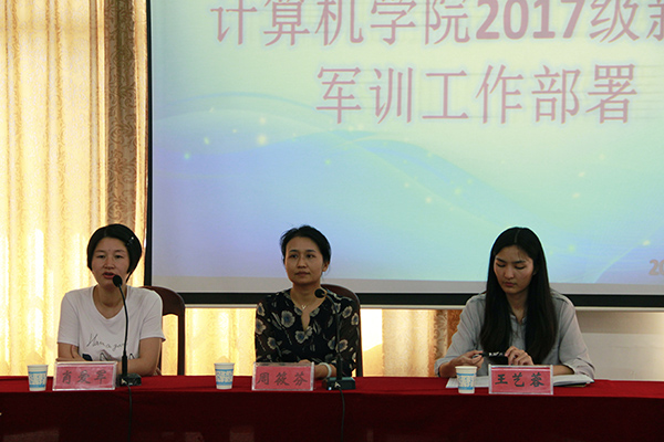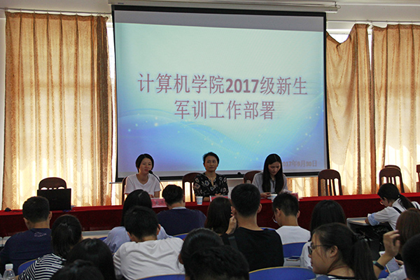 9月30日中午12点30分,计算机学院于逸夫楼108室召开2017级新生军训工作部署大会。院党委副书记周筱芬,学工办负责人肖爱军,辅导员老师王艺蓉。全体教官、2017级新生助班及全体学生会干部与会。会议由肖爱军主持。