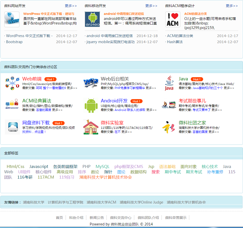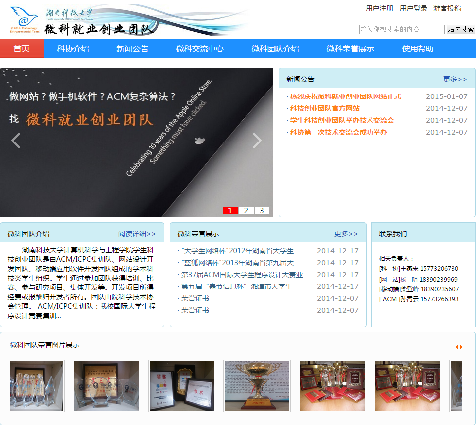 网站采用学院标志的蓝色色调作为主色调,设计清新明快、结构简单明了,团队动态一目了然。其中包括两个“微科荣誉展示”和“微科交流中心”特色栏目,展现了团队的风采和不断拼搏的信心。