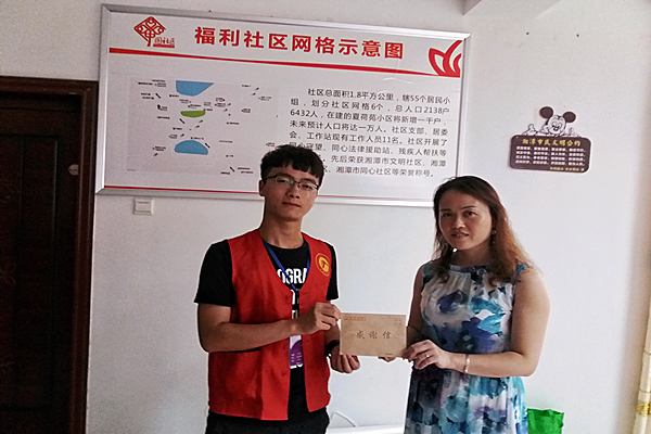 最后,在“三下乡”活动的结束仪式中,志愿者们与当地居民们合影留念,离开之际与居民们相互挥手告别。志愿者们不仅得到了当地居民的由衷赞扬,更收到了居委会刘主任的感谢信。