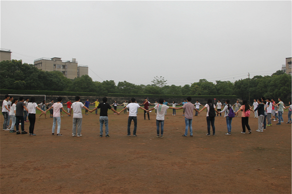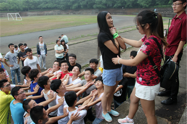 之后,进行随机分组,要求各队在三分钟内选出队长并确定队名、队训。 “颜值爆表队”、“什么都不队”、“超能陆战队”、“地底人队”、“皇家科协队”等队名相继确定之后,继续进行游戏。“精神集中”要求全队以统一的动作开展活动,由于游戏规则的多变,以及刚刚组队的默契度不够,难免会失败。失败的队伍,要求队长承担所有本队队员的一切惩罚,这不仅仅是一种惩罚,而是教导何为责任与担当。